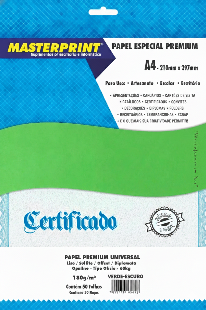 O Papel Offset Diplomata Verde Escuro 180g A4 da Masterprint oferece uma base sóbria e elegante para seus supper projetos mais refinados. Este papel premium é colorido na massa, garantindo uma cor verde profunda e uniforme em cortes e dobras, sem bordas brancas. Sua gramatura robusta de 180g/m² e pH neutro para maior durabilidade asseguram um acabamento impecável com a qualidade que a linha Diplomata da Masterprint representa.